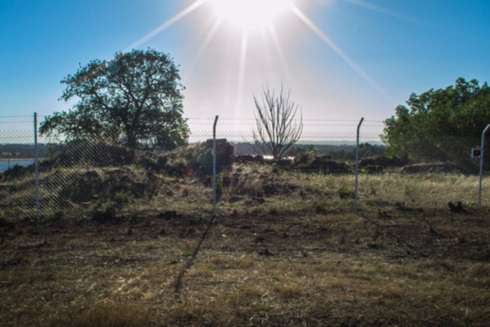 Stone ruins stand beside the road along with a monument which displays the following text: